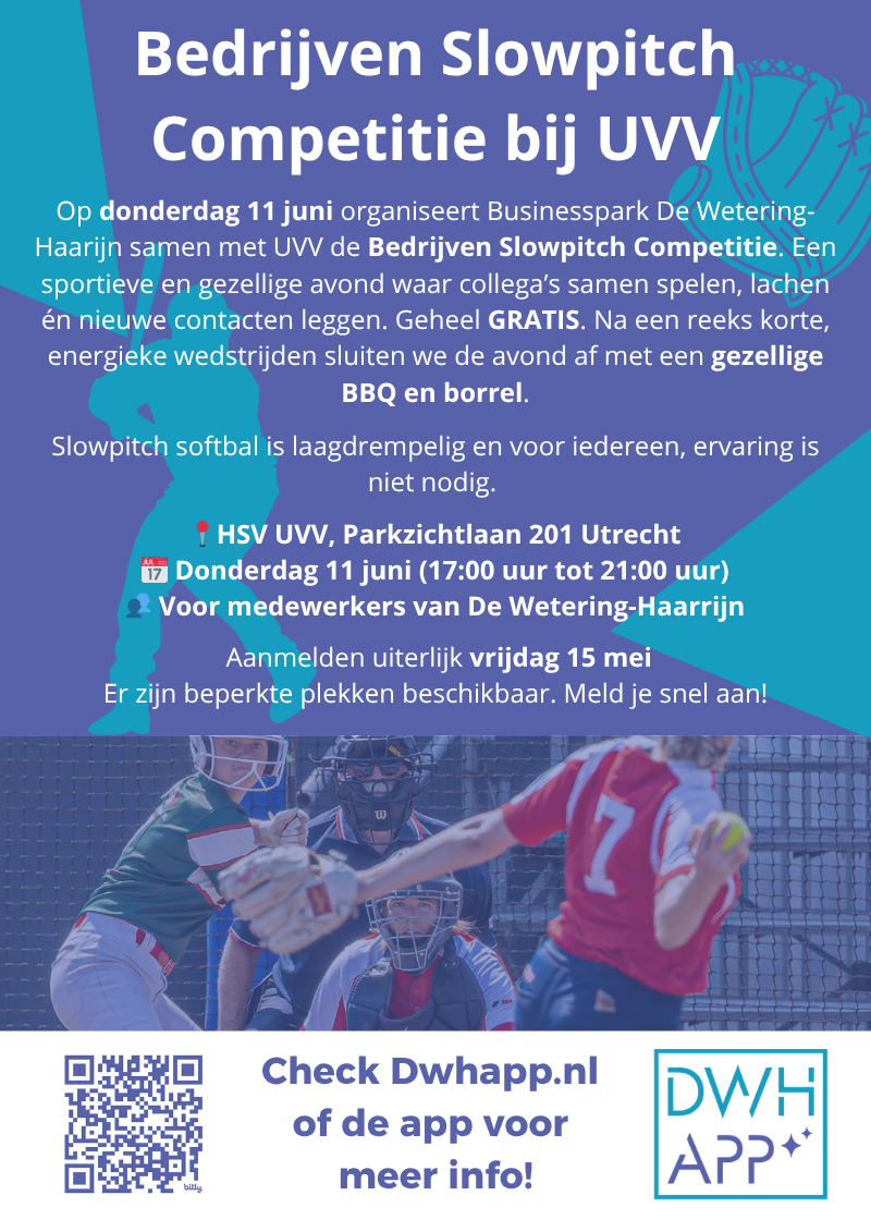 Elke dinsdag kun je meedoen met onze Lunchgames, perfect om even te bewegen en collega’s te ontmoeten. Op woensdag 23 maart trappen we het gaspedaal in tijdens onze Grand Prix™ bij Teamsport E-Karting, inclusief borrel. En op donderdag 11 juni organiseert Businesspark De Wetering-Haarijn samen met UVV de Bedrijven Slowpitch Competitie. Een sportieve en gezellige avond waar collega’s samen spelen, lachen én nieuwe contacten leggen